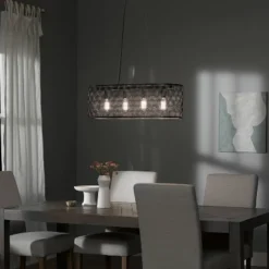 Upgrade your living room or dining room decor with the beautiful and versatile style of this Oil-Rubbed Bronze Metal and Crystal Hanging Lamp from River of Goods. Designed with a circular canopy made of metal in a dark oil-rubbed bronze finish, this semi-flush mount ceiling light also features faceted crystal panels around the outside and on the bottom for a stunning lighting look. This overhead light hardwires into your ceiling for a clean look, and makes a great choice to place above a dining table, in an entryway or in the center of your living room.