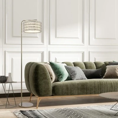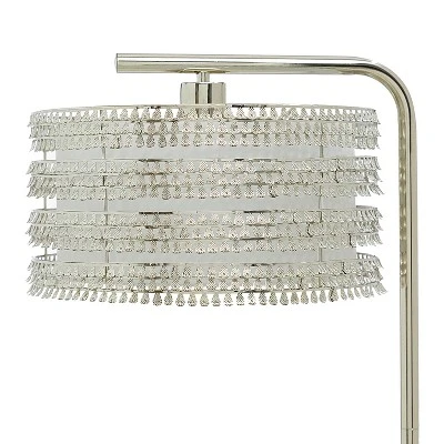 Add a glam lighting option to your bedroom, living room or foyer with this 61.5″ H Quigley Silver Drum Shade Floor Lamp from River of Goods. This floor lamp showcases a chrome-finish silver metal candlestick base and a white fabric drum shade with silver metal charms for a standout look with a touch of shine. The lamp requires one 60-watt E26 bulb (not included) to cast a soft, warm glow, and the 90-inch cord with a foot switch allows for versatile placement in any room.