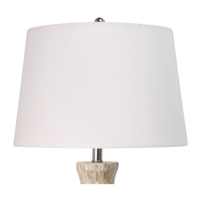This modern table lamp finds elegance in its detailed, delicate build. The curving white ceramic body presents Capiz shell accenting throughout, creating visual texture within its smooth walls. Above, a white linen drum shade forms a clean outline and matches the circular base made of clear crystal. For a final stylish touch, the neck and finial are finished in captivating chrome. This piece exemplifies superior product design and great styling. It will pair well with modern styling. If you put it in the bedroom or family room, this table lamp stands out. Suitable for residential use in a dry location. Due to lighting and monitor differences, actual colors and finishes may vary slightly from what appears online