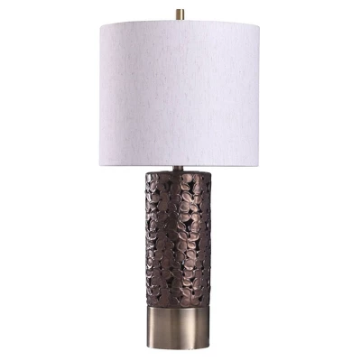 Accent your home décor with this Chesham Floral Design table lamp from the Signature Collection by StyleCraft Home Collection. Mixed materials create an impressive industrial look in this attractive table lamp. The body features ceramic and steel, with a brass base giving way to a long bronze mental section. The off-white shade consists of linen and polyester and adds to the lamp’s symmetry with its cylindrical form. This elegant piece brings fashionable design to bedrooms, living rooms and dining rooms. Regardless if you put it in the bedroom or family room, this table lamp stands out. Suitable for residential use in a dry location. This modern table lamp is UL listed in compliance with the nationally recognized safety standards. Due to lighting and monitor differences, actual colors and finishes may vary slightly from what appears online.