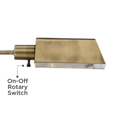 - Aged brass finish over metal construction. Adjustable swing arm.