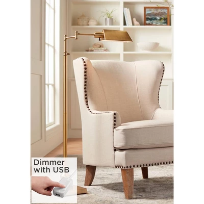 This adjustable swing arm pharmacy floor lamp with a USB dimmer features a metal tent shade that creates warm downward light ideal for reading or tasks. A convenient swing arm allows for adjustable illumination at a variety of angles. The aged brass finish offers true classic charm to this design. The tabletop dimmer works with dimmable CFL and dimmable LED bulbs, as well as halogen and incandescent bulbs, and it also comes with a built-in USB port, allowing you to easily charge phones and other devices.