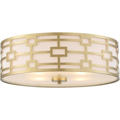 This charming modern flushmount ceiling light creates a look that will upgrade any hallway or room. The painted gold finish on the open decorative pattern work adds a luxurious touch, while the fabric shade and glass diffuser add a more casual feel to blend in with a variety of existing decor styles. Use this piece to add a simple, yet refined upgrade.
